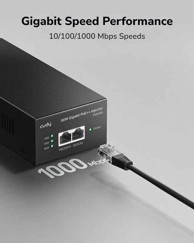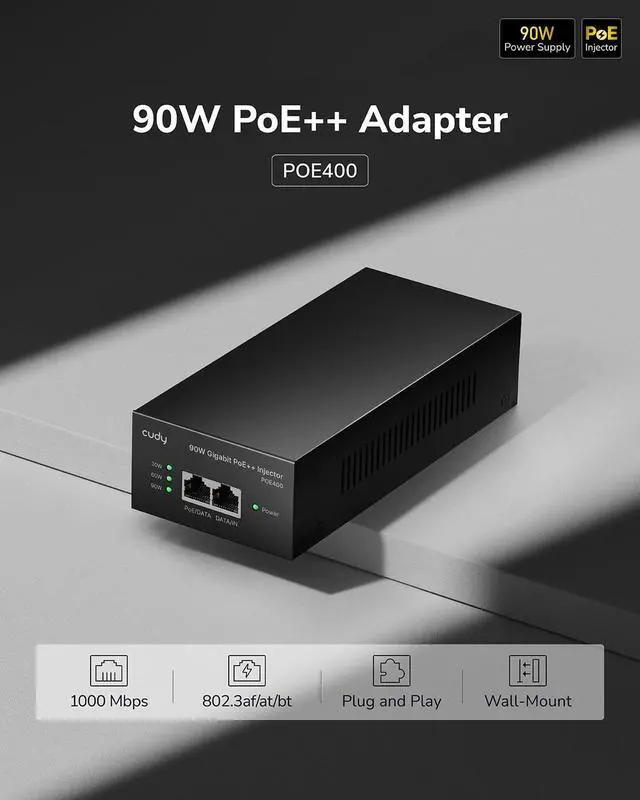 With Auto-sensing technology, this PoE adapter delivers up to 90W to a PoE++ device with backwards compatibility for 802.3bt/at 4 pair (60w), 802.3at 2 pair (30w) PoE+ device and 802.3af PoE (15.4W) devices.