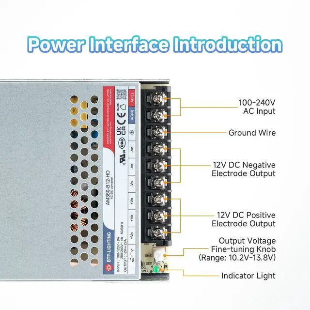 Input & Output Universal 100 - 240VAC or 120 - 370VDC input voltage). Provides a stable, adjustable DC 12V output (±10%, 10.8V13.2V) with up to 29A current and 350W power, supporting devices requiring 1A to 29A at 12V DC.