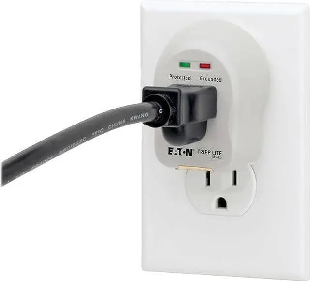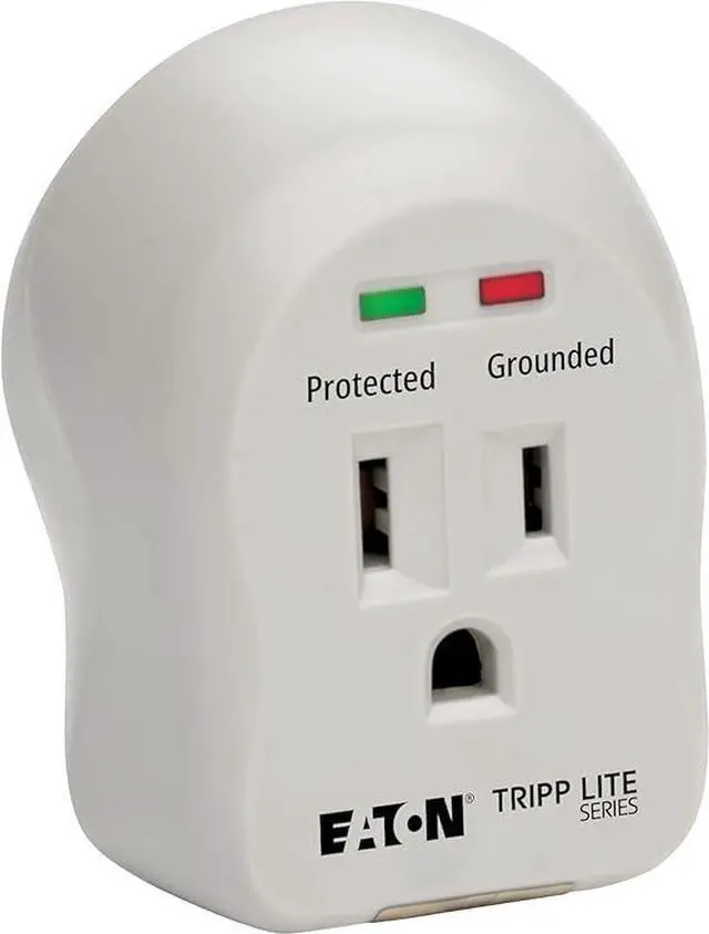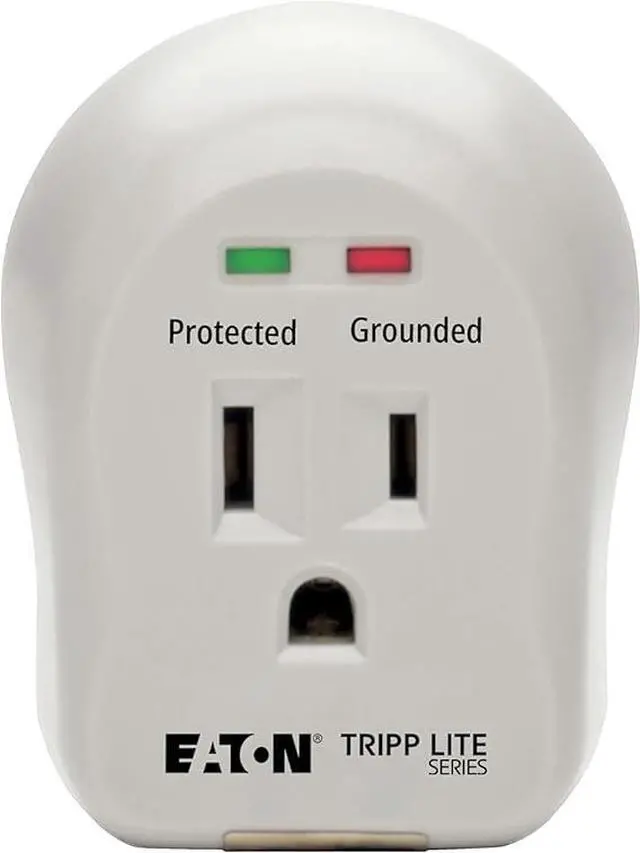SINGLE OUTLET SURGE PROTECTOR: Portable travel surge protector features 1 outlet and a 600 Joule rating at less than 1 nanosecond response time. Diagnostic LEDs green ""Protected"" and red ""Grounded"" LED illuminates to show device is operating.