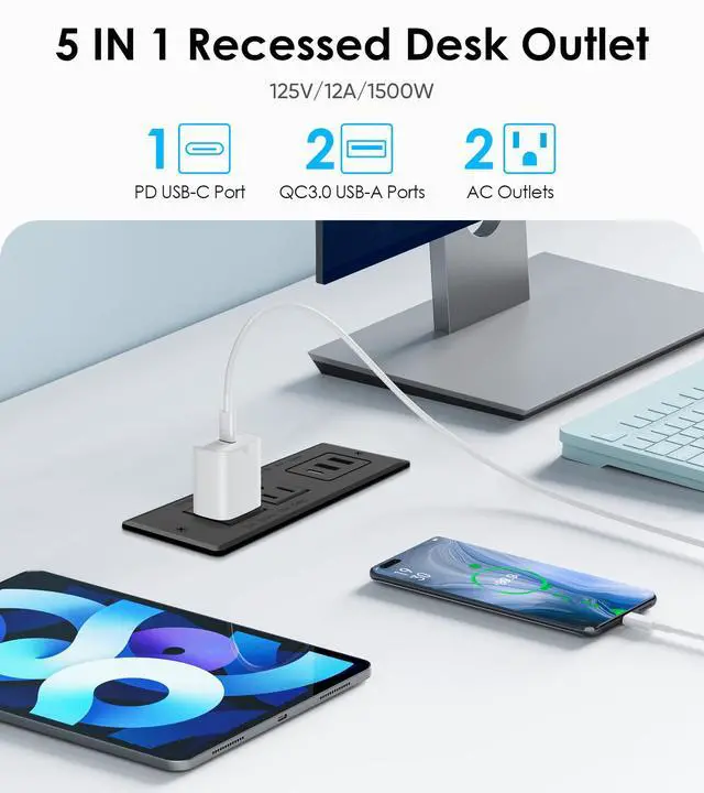 Recessed Outlet for Desk: 2 fast charging QC 3.0 20W Max USB-A ports and 1 PD 3.0 20W Max USB-C port. Comes with 2 AC outlets. Great addition to nightstand or furniture table.