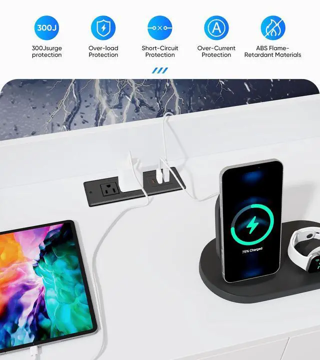 300J Surge Protection: Furniture recessed power strip with over-current, over-voltage, and short-circuit protection effectively protects your devices from damage and ensures safer overnight charging.
