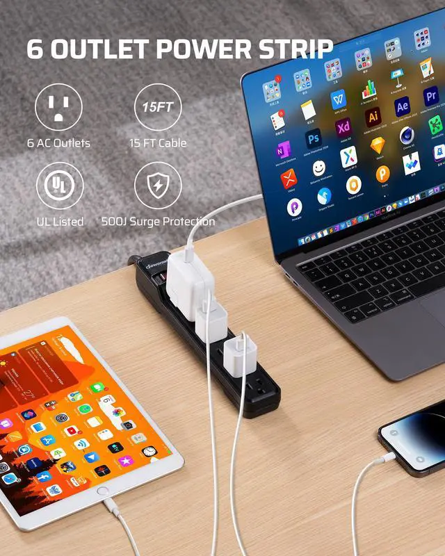 15 AMP Heavy Duty 6 Grounded 3 prong AC outlets; 15A / 120V / 1800W high power; heavy duty power strip surge protector is perfect for entertainment centers, offices, and anywhere multiple devices need power.