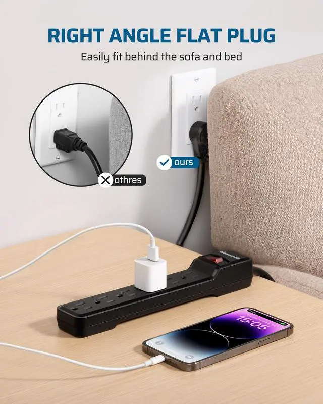 Low Profile Flat Wall Plug Right angle flat plug allows furniture to be pushed against the wall; the slim design is ideal for tight spaces behind TV bracket, sofa, nightstand, and headboard