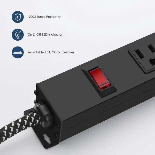 8 in 1 Power StripThis mountable power strip features 8 outlets and 1 switch, providing you with multiple options to connect your devices. The 6 feet 14AWG braided cord ensures durability and easy reach to power sources. Rated at 1200J, 1875W, 15A, 125V, 60Hz, it guarantees safe and reliable charging.