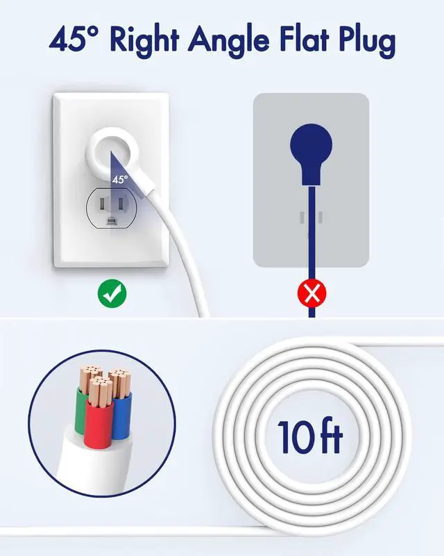 10 ft. Cord Surge Protector and Right Angle Power Strip: The 10 ft. extension cord is made from 18 AWG pure copper, known for its thickness and superior current-carrying ca