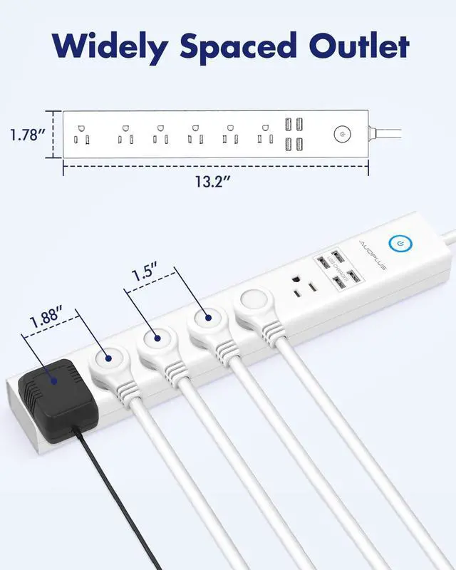 Power Strip Surge Protector with Wide-Spaced Outlets: This power strip features six surge protector outlets, five wide spaced and one extra wide spaced, offering a practical design that surpasses narrow ineffective socket panels. With a 10 ft. heavy-duty extension cord, it is the optimal length to cover your power adapters or chargers, satisfying all your charging needs at home and in the office.