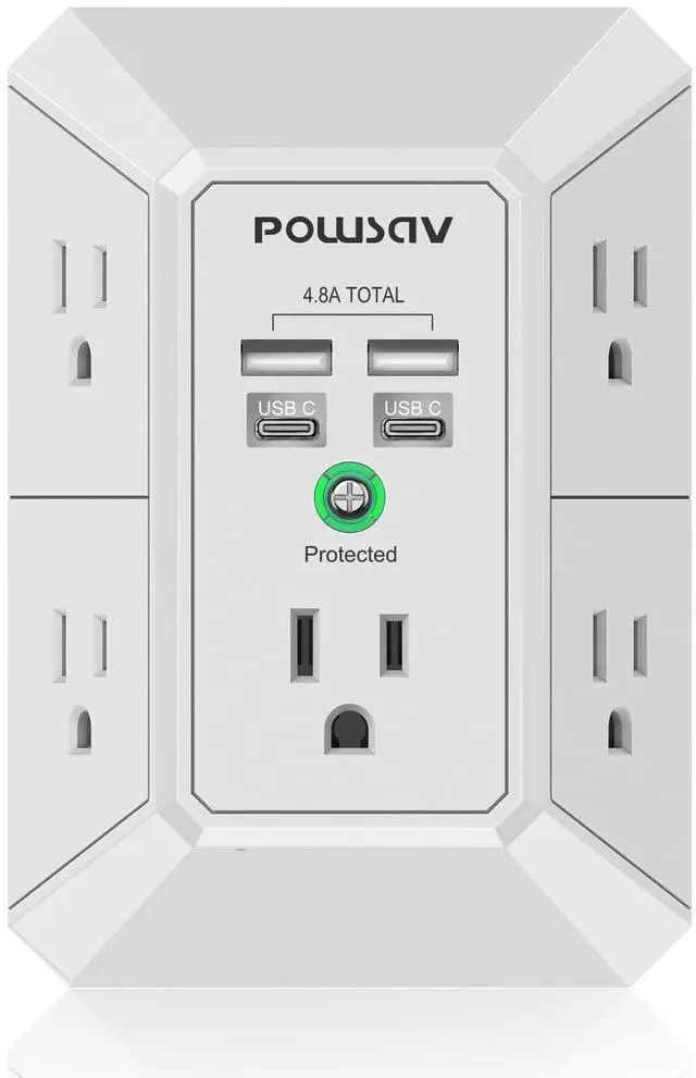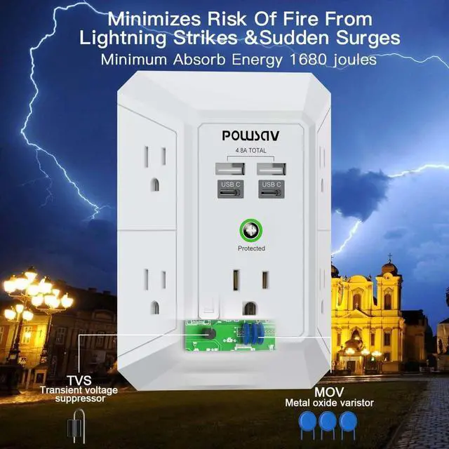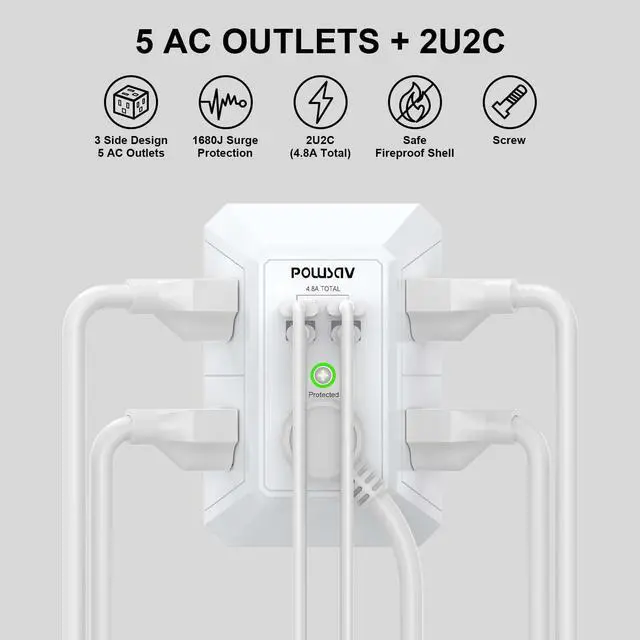 5 AC Surge Protector Outlets: 3 level complementary Surge Protector Circuit composed of TVS, MOV (metal oxide varistor), GDT (gas discharge tube), with minimum 1680J energy absorbing capacity, could protect your devices much more quickly. Fire-resistance shell with flame retardance at 1382 makes it more durable and longer lifetime. It truly provides great protection of your precious plugged-in devices.