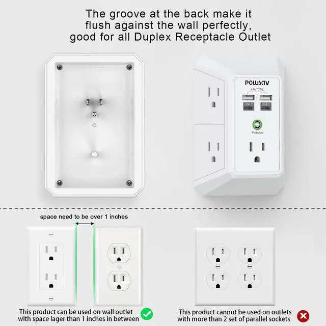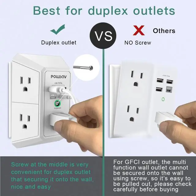 Widely Spaced & Fast Installation: This power outlet with 5 AC outlets built-in 1680 Joules surge protector with 2.1 inches long space in between; Large spacing can charge 5 big plugs at the same time without blocking; Just plug in for duplex outlet and décor outlet. And can use the screw included to secure it on duplex outlet.