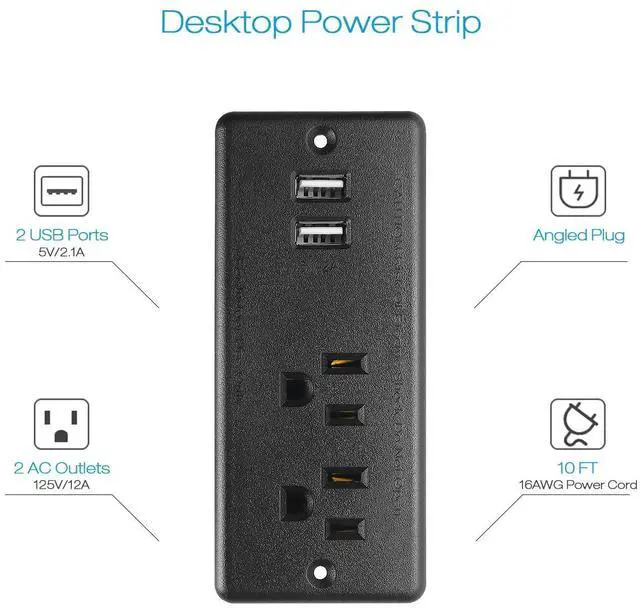 Recessed Power Strip Flat Plug, Desk Outlet with USB, Conference Recessed Power Outlet Socket with 2 AC Plugs, 2 USB Ports Connect with 10ft Power Cord for Furniture, Home, Office(Black)
