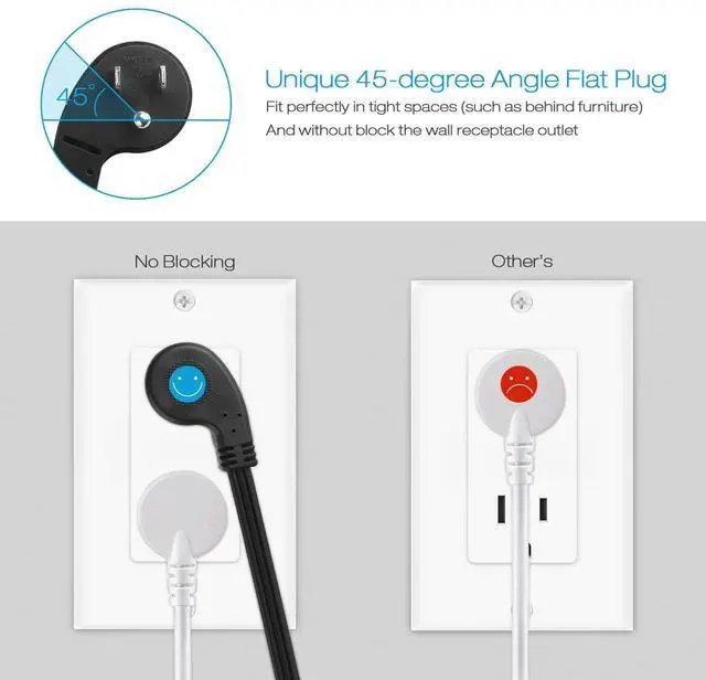 The recessed outlet includes an angled flat plug that fits perfectly in tight spaces, such as behind furniture, without blocking the wall receptacle outlet.