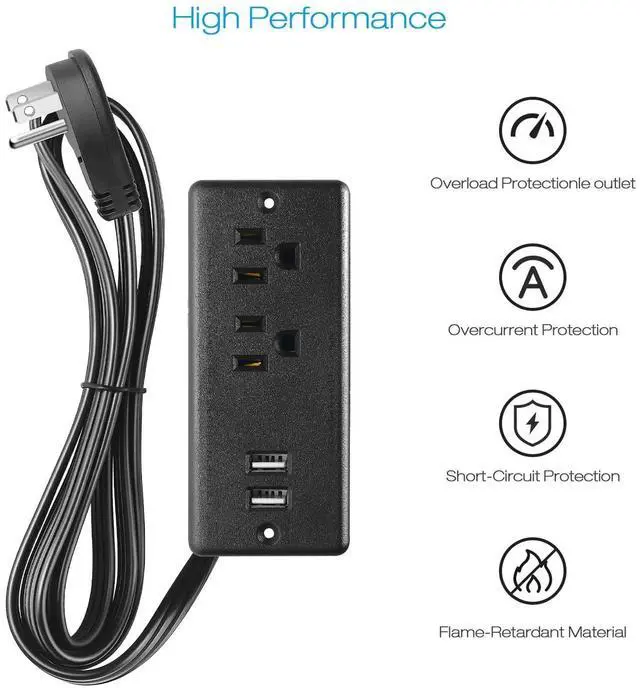 Recessed power outlet flat plug with USB features 2 standard AC outlets and 2 USB charging ports, connected by a 10ft 16AWG power cord.