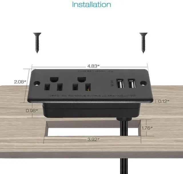 The dimensions of the furniture recessed power outlet socket fit a hole size of 4.83 x 2.08 x 0.98 inches. After installation, it will be 0.12 inches higher than the surface. The package includes screws.