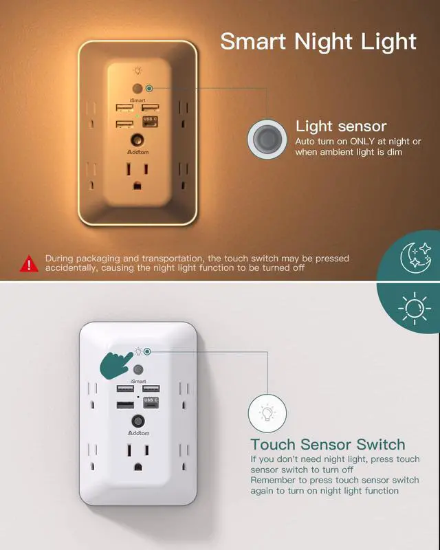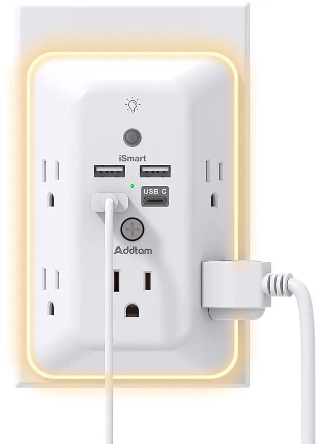 9 IN 1 USB Wall OutletThis device offers 4 USB charging ports (1 USB C) and 5 wide-spaced outlets. The 3-sided design plug extender provides ample space for larger plugs. An LED night light surrounding the outlet extender enhances convenience in dark environments. The removable screw and plastic prong ensure a secure attachment to wall outlets.