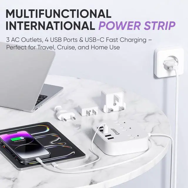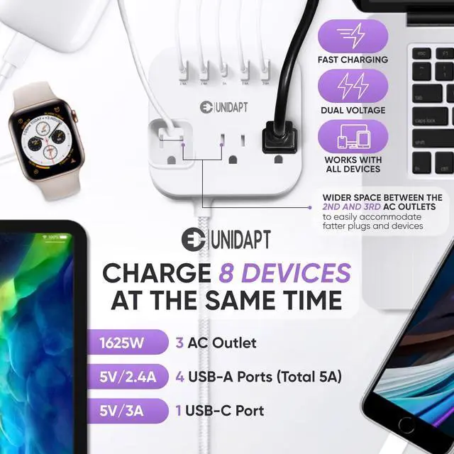 5 USB ports & 3 AC - It comes with 3 AC outlets, 4 USB ports (5V/2.4A each) & USB-C port (5V/3A Max). Simultaneously charge and power up to 5 of your USB devices at the same time. The plug adapter auto detects your devices for faster charging. It is compatible with travel essentials such as: tablet, lamp, power bank, headphone, speakers and other electrical devices.