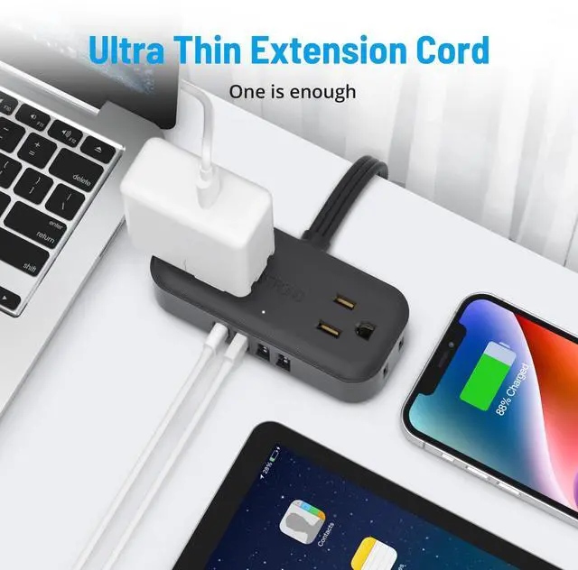 Ultra Thin Flat Plug and Extension Cord: With a sleek 0.33-inch ultra-thin plug, the slim flat plug can easily fit into tight spaces. The 45° right angle design prevents blockage of the bottom plug. The 5ft slim extension cord, measuring only 0.15 inches thick, is perfect for placing under carpets and fitting through door gaps without being caught by the door.