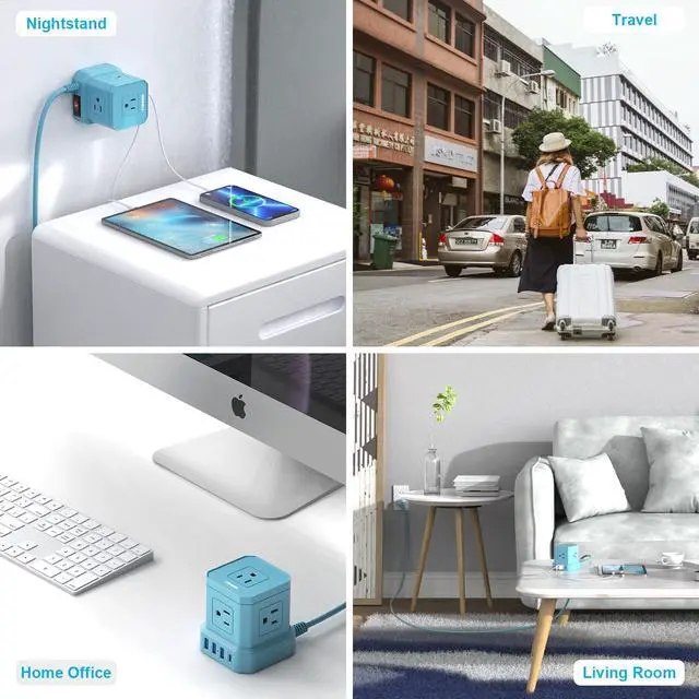 [Flat Plug with 10FT Extension Cord] - Designed with a small-profile 45° flat plug, allowing it to be plugged into the top or bottom socket in a wall outlet, and fits easily into outlets tucked away behind your bed, sofa, or other furniture. The cord is 10 feet long, providing the power cube with a lot of mobility and serving as an extension outlet for hard-to-reach AC outlets.