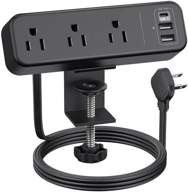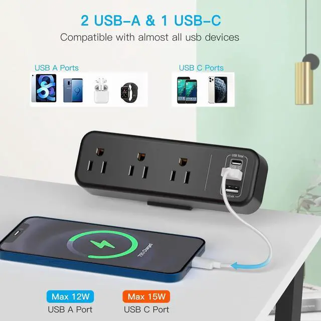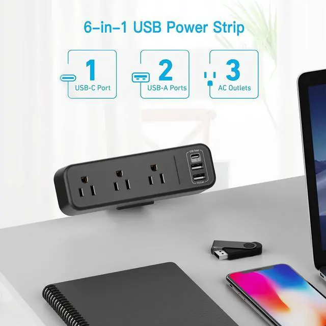 Desktop Power Strip: This desk charging station features 3 AC outlets (1625W/13A) and 3 USB ports connected with a 6.5 ft thin extension cord. The flat cord design enhances flexibility and durability, reducing the risk of damage compared to typical circular cords. More durable and less likely to deform.