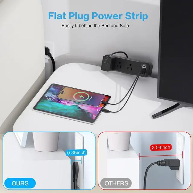 Thin Flat Plug Power Strip: The width of the thin flat plug is 0.35 inches, making it significantly thinner than traditional plugs. This allows the flat plug extension cord to sit closer to the wall, easily hiding behind furniture, sofas, and beds.
