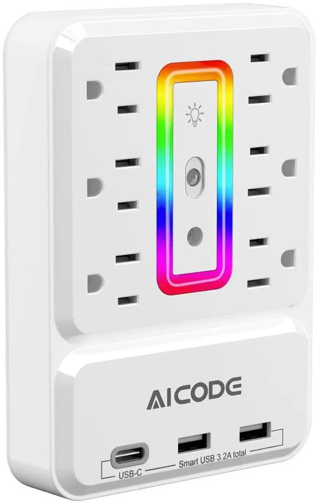 Outlet Extender with USB, Multi Outlet Surge Protector with Nightlight, 6 Outlet Wall Plug with USB (3 USB A and 1 USB C), Wall Mount Multiple Plug Outlet Power Strip for Home, Dorm, Office