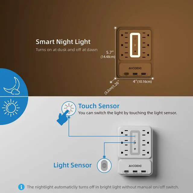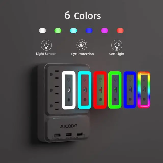 6 LIGHTING MODES: The wall lamp socket is equipped with a 0.6W intelligent night lamp and a 1.2W RGB adjustable atmosphere lamp, with built-in intelligent chips that can automatically identify light and shade, and adjust brightness according to the intensity of the night without irritating the eyes, photosensitive without on/off switch.