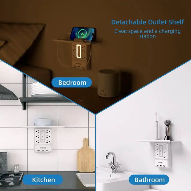 WALL OUTLET EXTENDER WITH USB C: Removable sturdy shelf (5.7 x 4 x 1.26 inches), easy to install and enables your electric toothbrush and razor to be placed on the shelf while charging. Great for placing items to avoid getting wet and keep your bathroom neat and tidy.