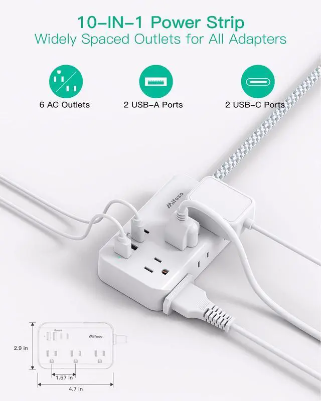 10 in 1 Power Strip with USB - The 3-side extension cord features 6 AC widely spaced outlets (1875W/125V/13A) and 2 USB-A and 2 USB-C ports (5V/3.1A/15W in total), enabling the simultaneous charging of 10 devices. It is suitable for use in homes, offices, and dorm rooms.