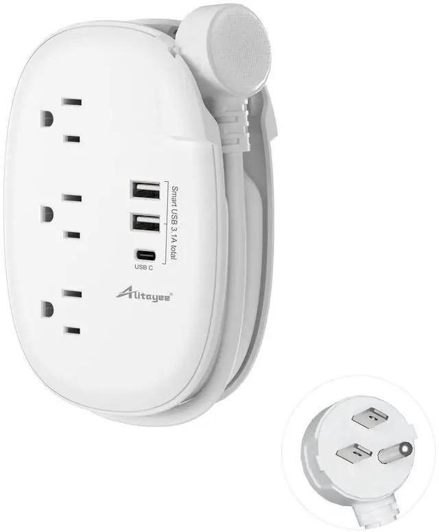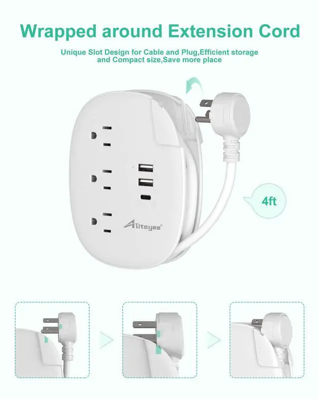 USB Travel Power Strip with Wrapped Extension Cord - The 4ft retractable extension cord features a 45-degree right-angled flat plug, allowing easy access to hard-to-reach places. The 3-prong grounded right-angle flat plug keeps your other wall outlets available, making it better for use on a desktop or nightstand.