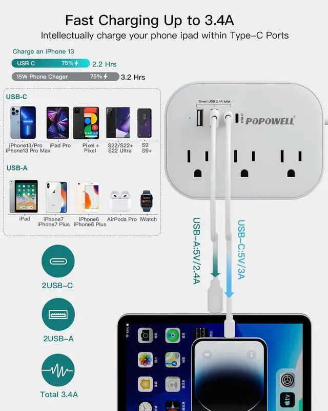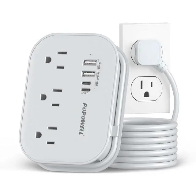 6 IN 1 Desktop Power Strip with USB C Ports - This flat extension cord features 2 AC outlets (1250W/10A) and 4 USB ports (5V/3.4A), allowing you to power up to 7 devices simultaneously. The dual USB A ports charge up to 2.4A, while the USB C port can deliver up to 3A, with a total output of 3.4A. Thanks to Smart IC charging technology, it can connect all your devices and achieve faster charging efficiency, ideal for your cell phone, earphones, cameras, laptops, power banks, and more.