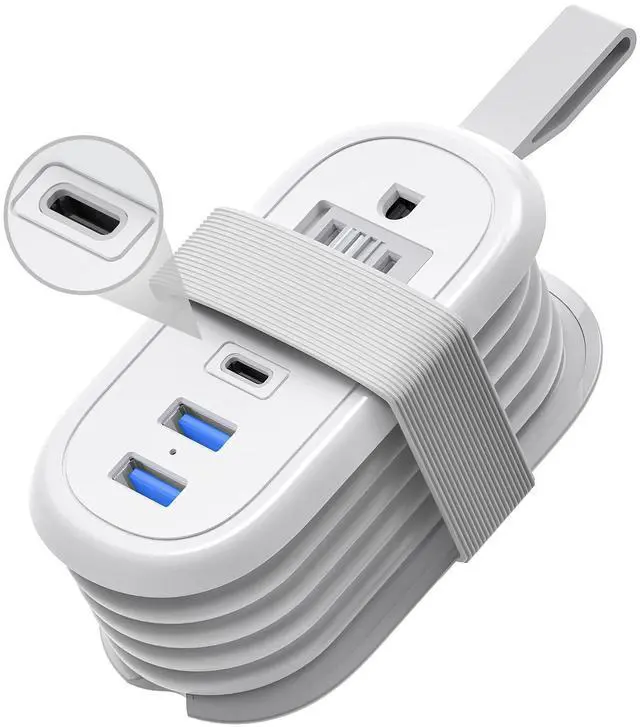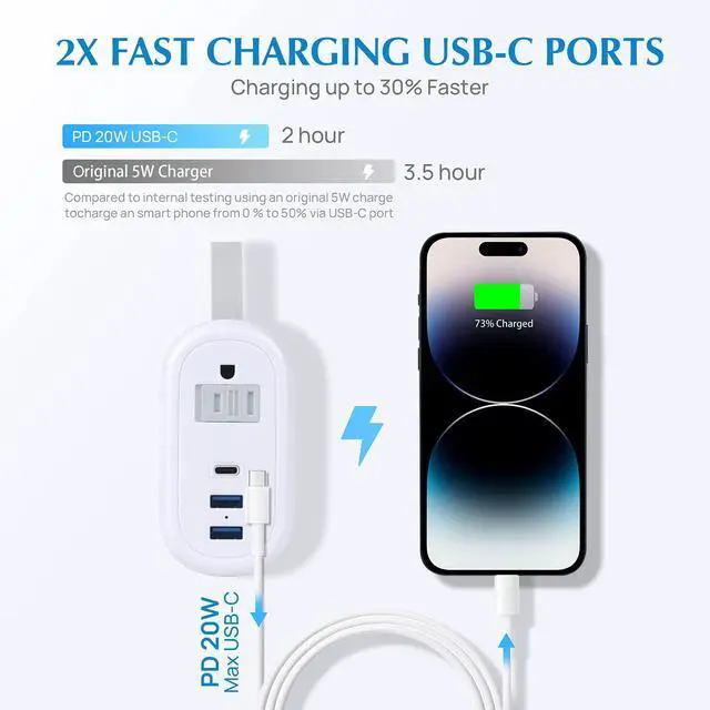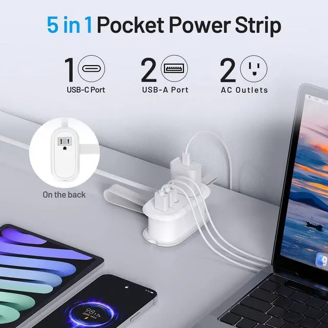 5 IN 1 Multi Device Charging 2 AC outlets, 2 USB-A (5V/2.4A each; 3.4A total), and 1 USB-C. This power strip can charge up to 5 devices at the same time, saving space and keeping your desktop organized.