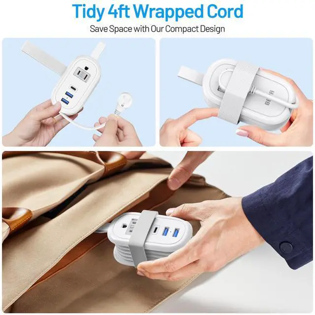 4FT Travel Extension Cord This travel extension cord wraps around itself to make it easy to pack. With dimensions of only 3.93 x 2.08 x 1.67 inches, it's a perfect space-saving design that you can carry around with you.