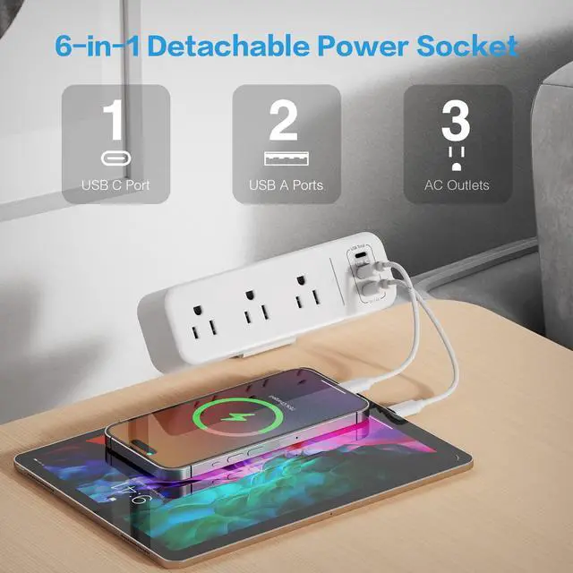 Desktop Power Strip: This desk clamp power strip features 3 AC outlets (1625W/13A) and 3 USB ports connected with a 6.5 ft thin extension cord. The flat cord design enhances flexibility and durability, reducing damage to the cord. It is more robust and less prone to deformation.