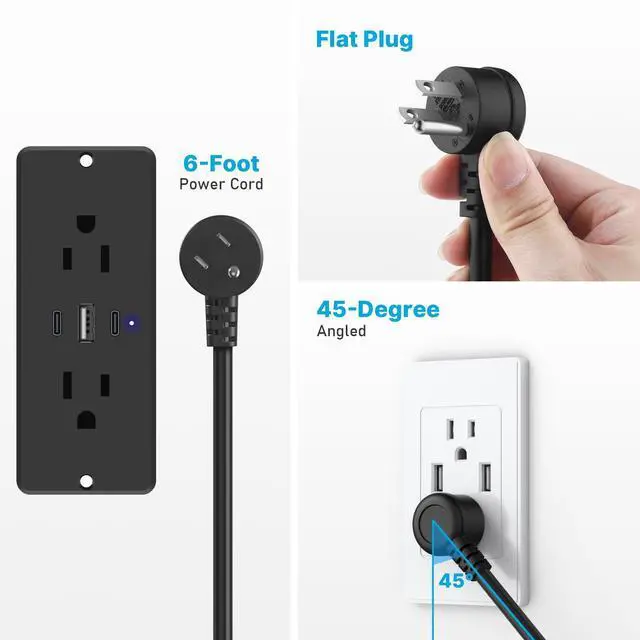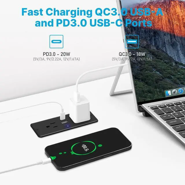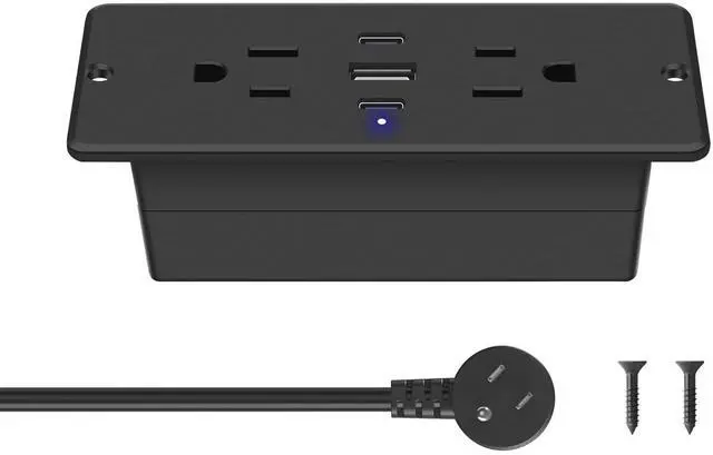 Recessed power strip built in 2 outlets and 18W QC 3.0 USB A and 20W PD 3.0 USB C, equipped with a slim plug. It reduces the number of power strips under your desk and helps manage cables.