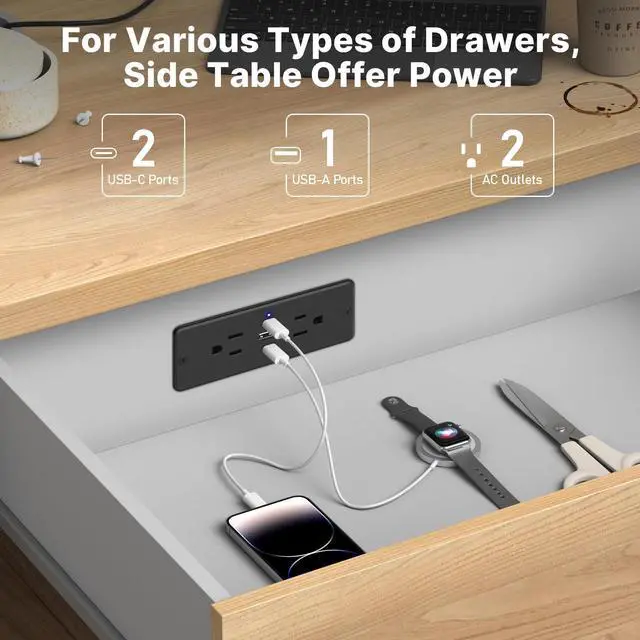 Suitable for furniture DIY, countertop, or workbench use, made of ABS and fireproof material, featuring a safety system with short-circuit, grounded, overload, and over-voltage protection. Please check whether each port is working properly before use.
