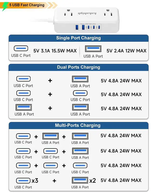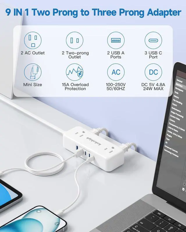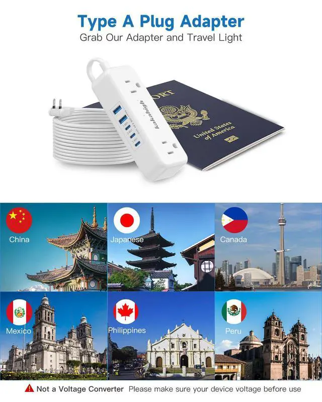 7-IN-1 Type A Plug Adapter The 2 to 3 prong outlet adapter can turn 1 type A socket into 2 AC outlets and 2 two-prong outlets, supporting a dual input range of 100V-250V, 3750W max (1875W at 125V), and 3 USB ports (5V/3.4 A 17W MAX), allowing you to charge 7 devices at a time, compatible with cellphones, tablets, cameras, etc.