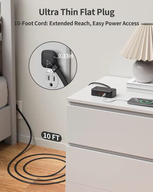[Extremely 10 ft Thin Extension Cord]: The 10-foot flat cable is 50% thinner than traditional power cords, allowing you to run it under a rug or along walls without adding bulk or creating a trip hazard. It keeps cords hidden and allows furniture placement without having to accommodate them.