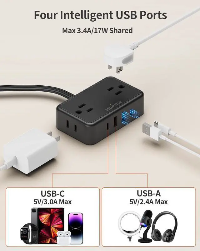 [8-IN-1 Power Strip]: Equipped with 4 AC outlets and 4 USB (2 USB-C) ports, this 10 ft power strip with USB ports turns 1 outlet into 8, enabling you to power 8 devices simultaneously, saving time. The extension cord with multiple outlets has a wide compatibility range. AC outlets with a maximum of 1625W are compatible with laptops, PCs, printers, TVs, routers, lamps, and more. USB-C ports with a maximum of 15W are adaptable to phones, watches, and speakers. The USB-A port with a maximum of 12W fits fans, power banks, and more.