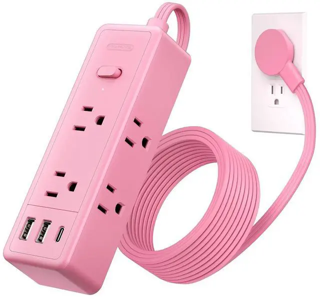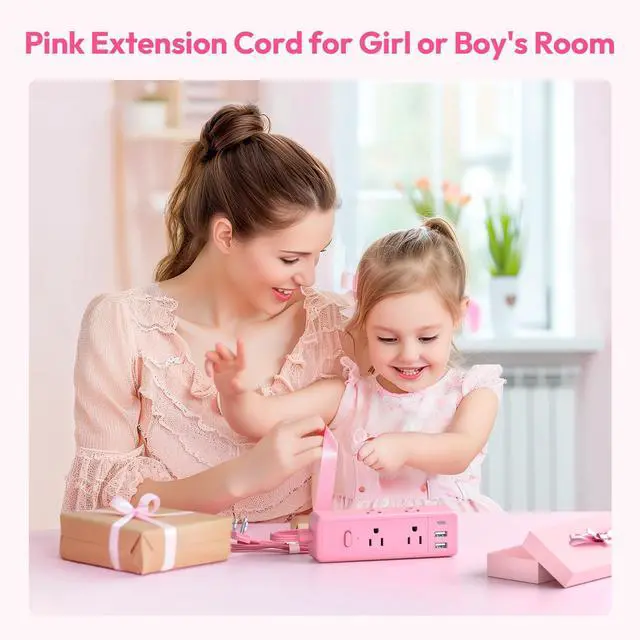 Cute Gift & Ideal for Pink LoversThis adorable pink extension cord is a perfect gift for kids or couples. It adds a charming touch to a bedroom, dressing table, or nightstand. With two drill-free hanging holes, you can easily mount it on the wall of your dorm, on your dressing table, or discreetly hide it under the table to enhance the room's aesthetics.