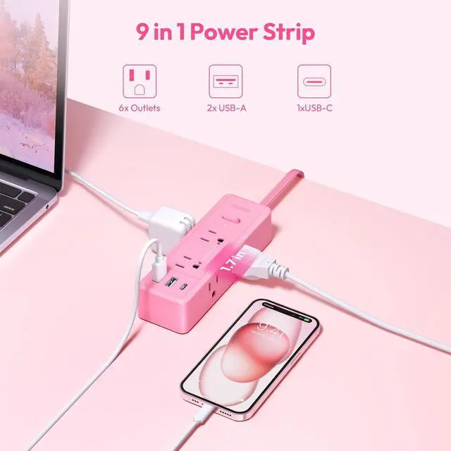 9 in 1 Extension CordThis flat plug power strip features 6 AC power outlets, 2 USB-A ports, and 1 USB-C port, allowing you to connect 9 devices simultaneously. No additional converters are necessary to charge your mobile phones, tablets, cameras, and headphones, optimizing your desktop space while creating a cute and dreamy style in your room.