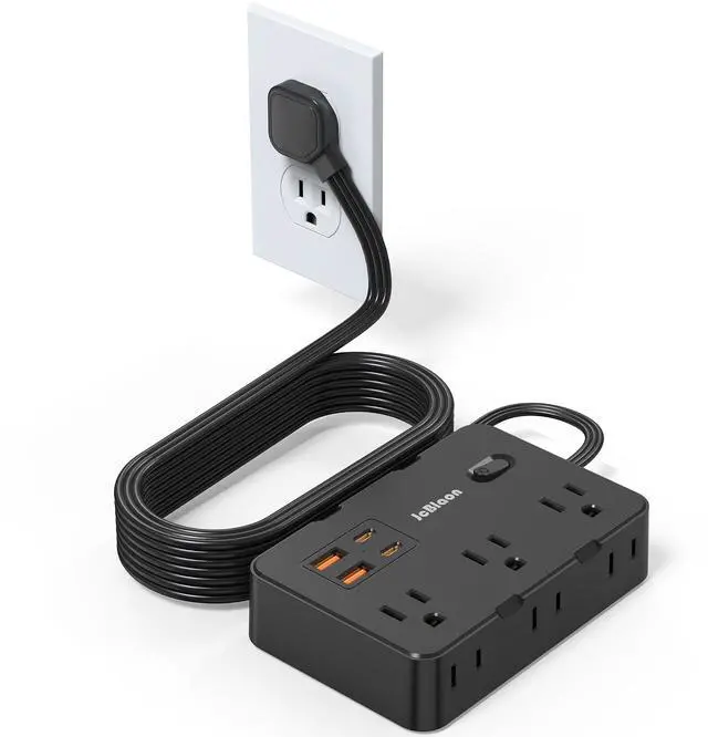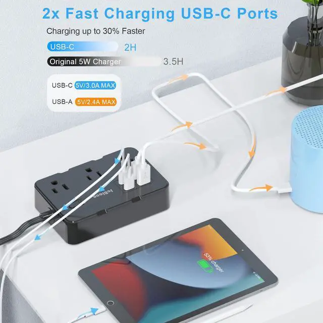 USB Charging Station - This power strip includes four USB ports, with a total USB output power of 5V DC 3.1A. It features two USB-C ports (5V DC 3.0A) and two USB-A ports (5V DC 2.4A), catering to various charging needs. With smart charging technology, the outlet extender auto-detects your devices for faster charging efficiency, perfect for your smartphone, tablet, Bluetooth earphones, etc.