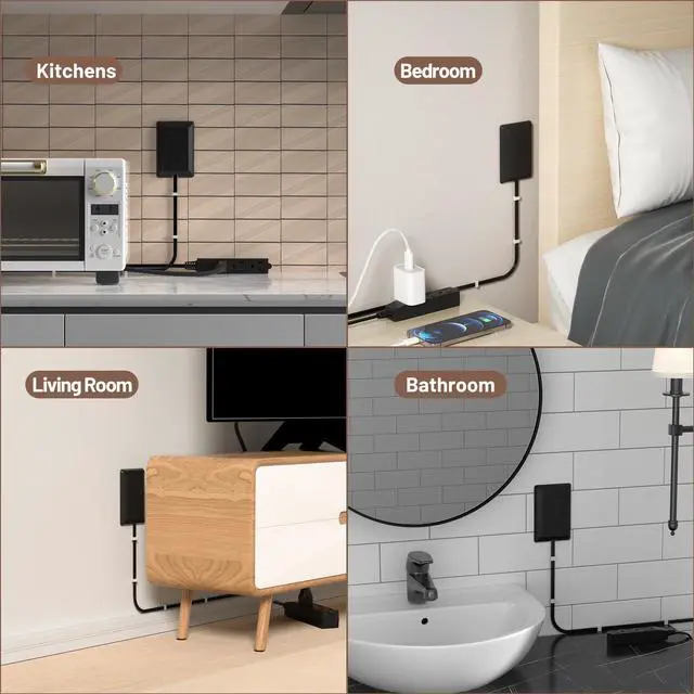 Different Size Extension Cords: Ultra-thin outlet cover concealer kit comes with 3ft/8ft length flat power cord, provides 13A/125V/1625W standard 3 outlet power strips, which can satisfy your daily power needs and improve the happiness of your life.