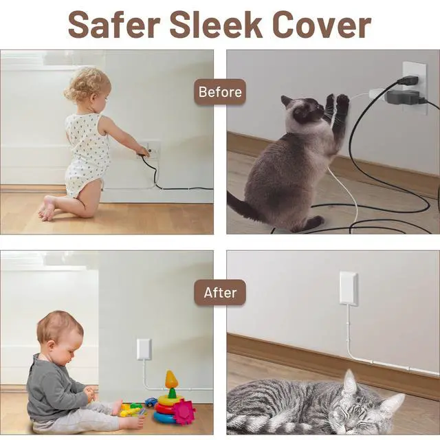 Safety Protection Cover--Sleek ultra-thin cover perfectly covers the electrical outlet, effectively protecting curious children and pets; Included cord concealment kit secures extension cords to the wall, avoiding the risk of exposed outlets or tangled cords.