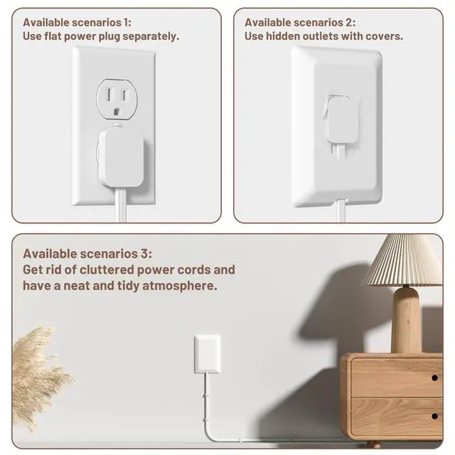 Hidden Detachable Flat Plug--Ultra-thin 0.39 inch thick flat grounding plug is perfect for hiding behind furniture such as sofas, desks, nightstands, etc.; Can be removed from the outlet cover to use the flat plug extension cord separately.