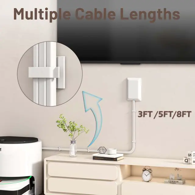 Different Size Extension Cords--Ultra-thin outlet cover concealer kit comes with a 3ft/8ft length flat power cord, providing 13A/125V/1625W standard 3 outlet power strips, which can satisfy your daily power needs and improve the happiness of your life.