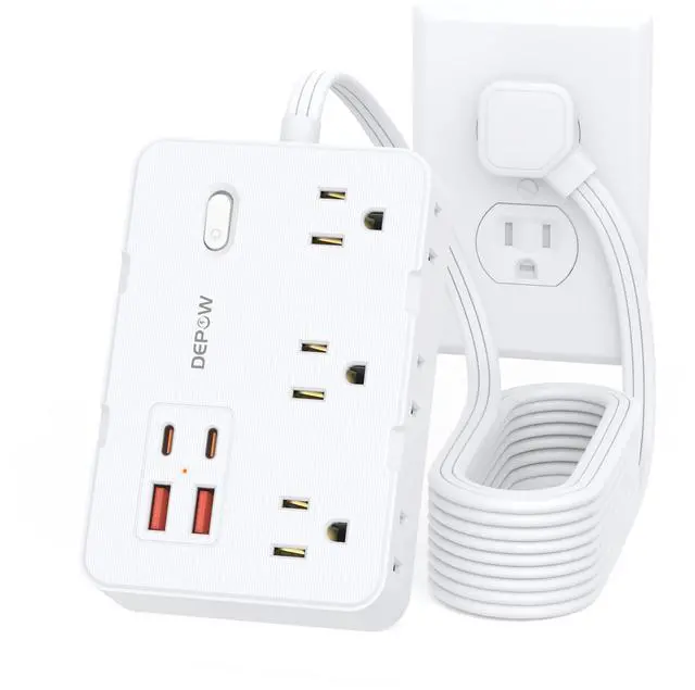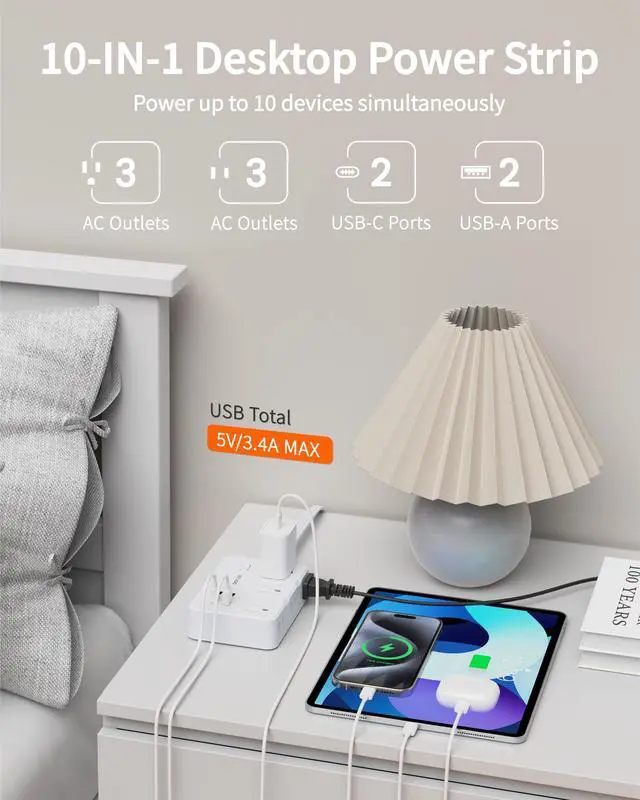 10-in-1 Desktop Power Strip: Equipped with 6 AC outlets and 4 USB (2 USB-C) ports, this slim 10 ft power strip turns 1 outlet into 10, allowing you to power 10 devices simultaneously to save more time. This extension cord with multiple outlets has a wide range of compatibility, supporting laptops, PCs, printers, TVs, routers, lamps, phones, watches, fans, and more.
