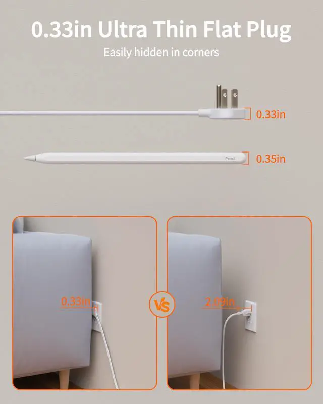 Ultra Thin Flat Plug & 10 Ft Extension Cord: Featuring a 0.33-inch ultra-thin plug, much slimmer than traditional plugs, it allows easy access to any wall socket and can be discreetly hidden behind furniture. The 45° right-angle design will not block the bottom receptacle of your duplex wall