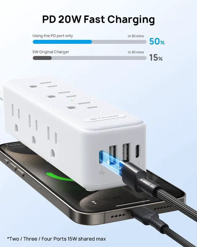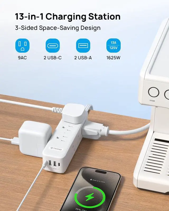 Power Strip with Multiple Outlets: This flat plug power strip features 9 AC outlets, 2 USB-C, and 2 USB-A ports, enabling the charging of 13 devices simultaneously without blocking. The 20W USB C power strip offers fast charging for your phone. The 3-sided design saves more space for your home, office, and college dorm room.