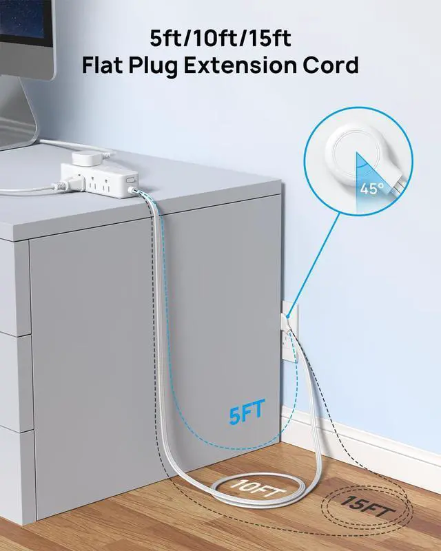 Flat Plug Extension Cord: This power strip is equipped with a 0.33 ultra-thin flat wall plug and an ultra-flat extension cord, easily fitting into tight spaces and allowing you to push furniture against the wall. The 45° right angle design creates extra space for other plugs below without blocking.