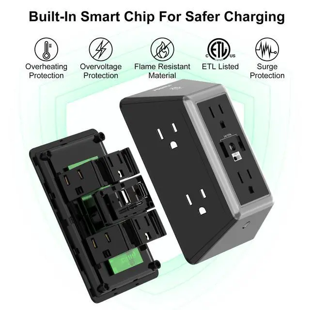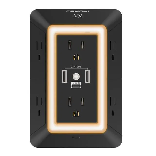 Multi-function USB Wall Outlet: 3 USB fast charging ports (1 USB C Port), 3-sided Power Strip, with 6 Adapter Spaced Outlets, and LED night light around the edges. Taking the place of a standard socket, it offers you many more plugs. Can be used in any room or public areas indoors. Save space with a unique 3D design. NOTE: The USB-C port doesn't support any other devices that need 14~22V charging voltage.