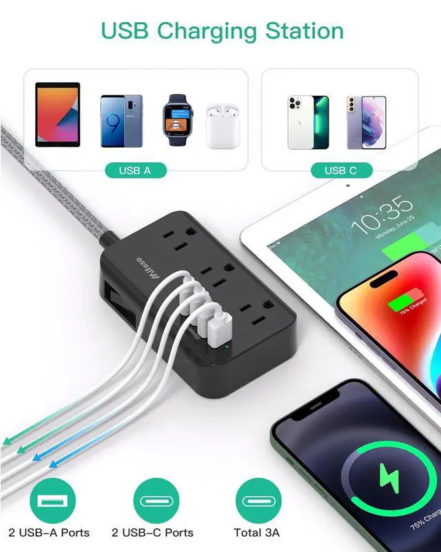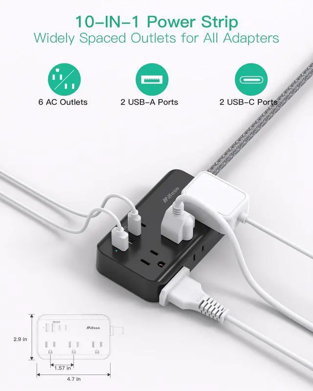 10 in 1 Power Strip with USB - This 3-side extension cord features 6 AC widely spaced outlets (1875W/125V/13A) and 2 USB-A and 2 USB-C ports (5V/3.1A/15W total), enabling you to charge 10 devices simultaneously. Perfect for charging cellphones, laptops, tablets, cameras, and more, making it suitable for home, office, and dorm room use.