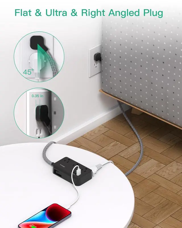 Ultra Thin Flat Plug - With only a 0.35 inch ultra slim design, this wall flat plug is thinner than traditional plugs, allowing it to sit closely against the wall and fit into tight spaces behind furniture like sofas, nightstands, bookshelves, and headboards.